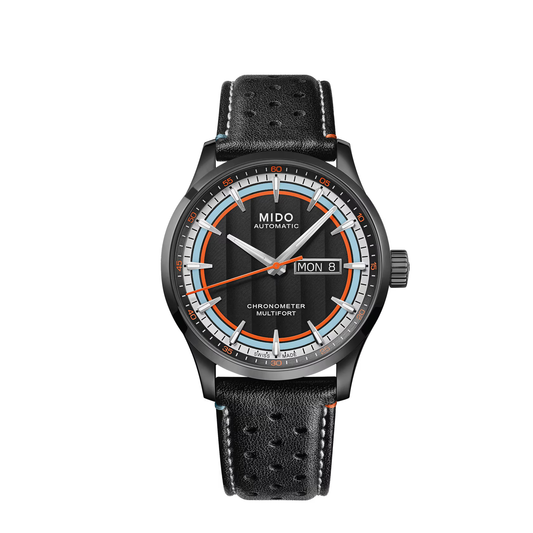 Framed by a black and dark gray 24-hour GMT bezel, the dark brown-gray dial features gold accents, a date calendar, a GMT hand, and LumiBrite hands and markers. The screwdown see-through caseback provides a view of the 24-jewel movement with manual winding capability, a frequency of 21,600 vibrations per hour and a power reserve of approximately 41 hours. Crafted of stainless steel, in a new hairline finish suggesting the metallic, machine-like feel of ’60s cars, this memorable timepiece includes a brown perforated leather strap echoing classic interior elements. 10 bar, 100M Water Resistant.