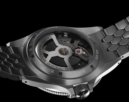 The exhibition case back sapphire crystal reveals our new CMM.10 Manufacture caliber while securing a 30 BAR (300m/990 feet) water resistance.