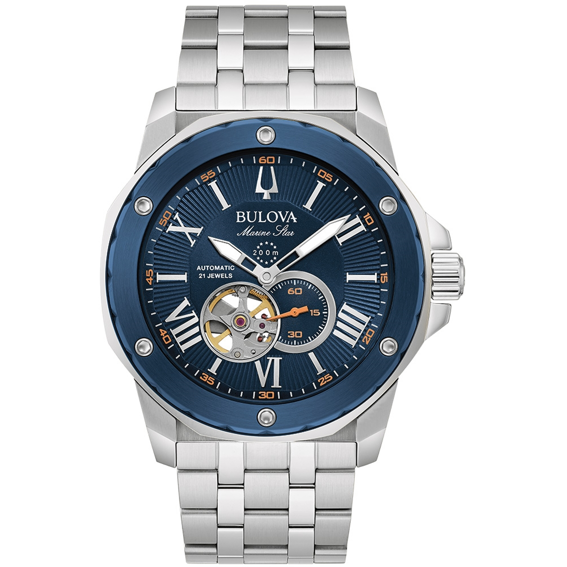 This new Bulova Marine Star men’s watch combines classic nautical styling with a legacy that reaches back decades. The bold, angular silver-tone stainless steel case features brushed finishing with polished accents, a deep blue bezel, a flat mineral crystal, and a screw-down crown. The striking blue dial combines sunray texture along the hour track and a central dial with a radiant sunburst finish, complete with hands with luminescent treatment, polished indices, and a running seconds sub-dial with orange accents. Visible through both the dial aperture and an exhibition case back, the open heartbeat automatic movement features 21 jewels and a 42-hour power reserve. The 45mm watch is complemented with a matching silver-tone stainless steel bracelet with a push-button deployant clasp. The watch is water resistant to 200 metres, living up to its name as a timepiece that can go wherever you do without missing a beat.