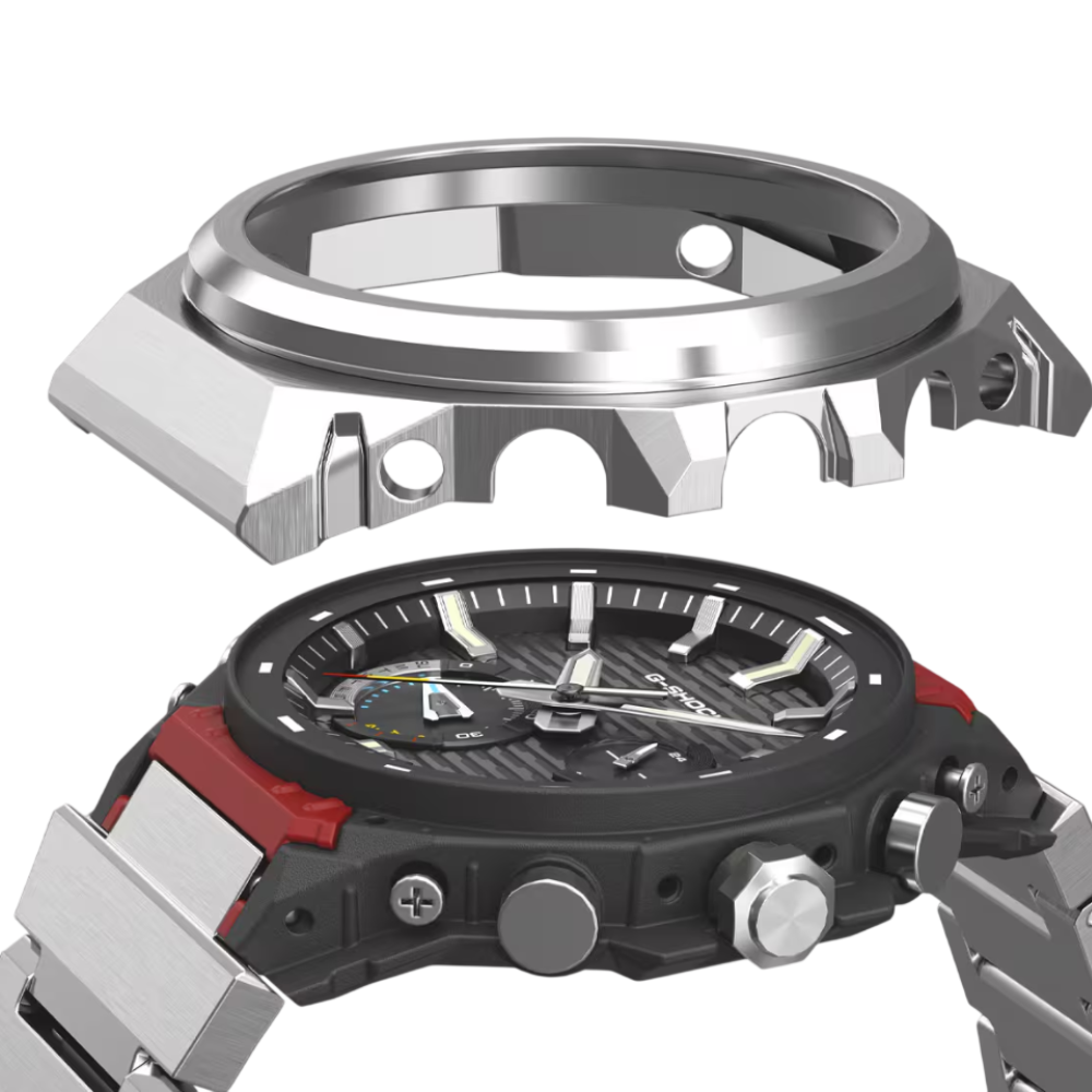 We’ve incorporated details from the DW-5000C, the very first G-SHOCK, adding sporty touches like the original’s signature bezel shape and brick pattern. The GST-B1000D-1AJF features accent colors inspired by the first G-SHOCK: red symbolizing the passion to take on challenges, blue representing water resistance, and yellow signifying outstanding shock resistance.