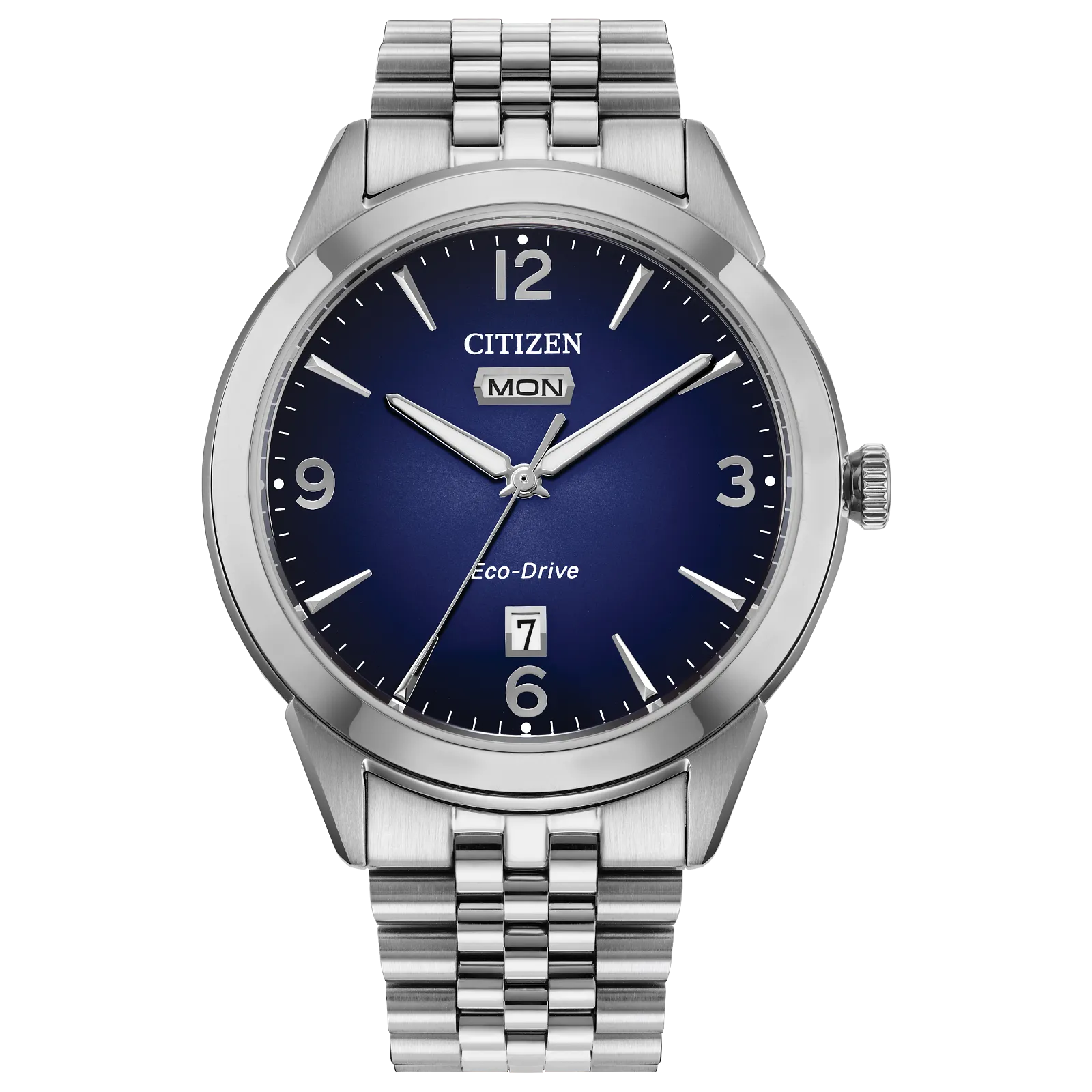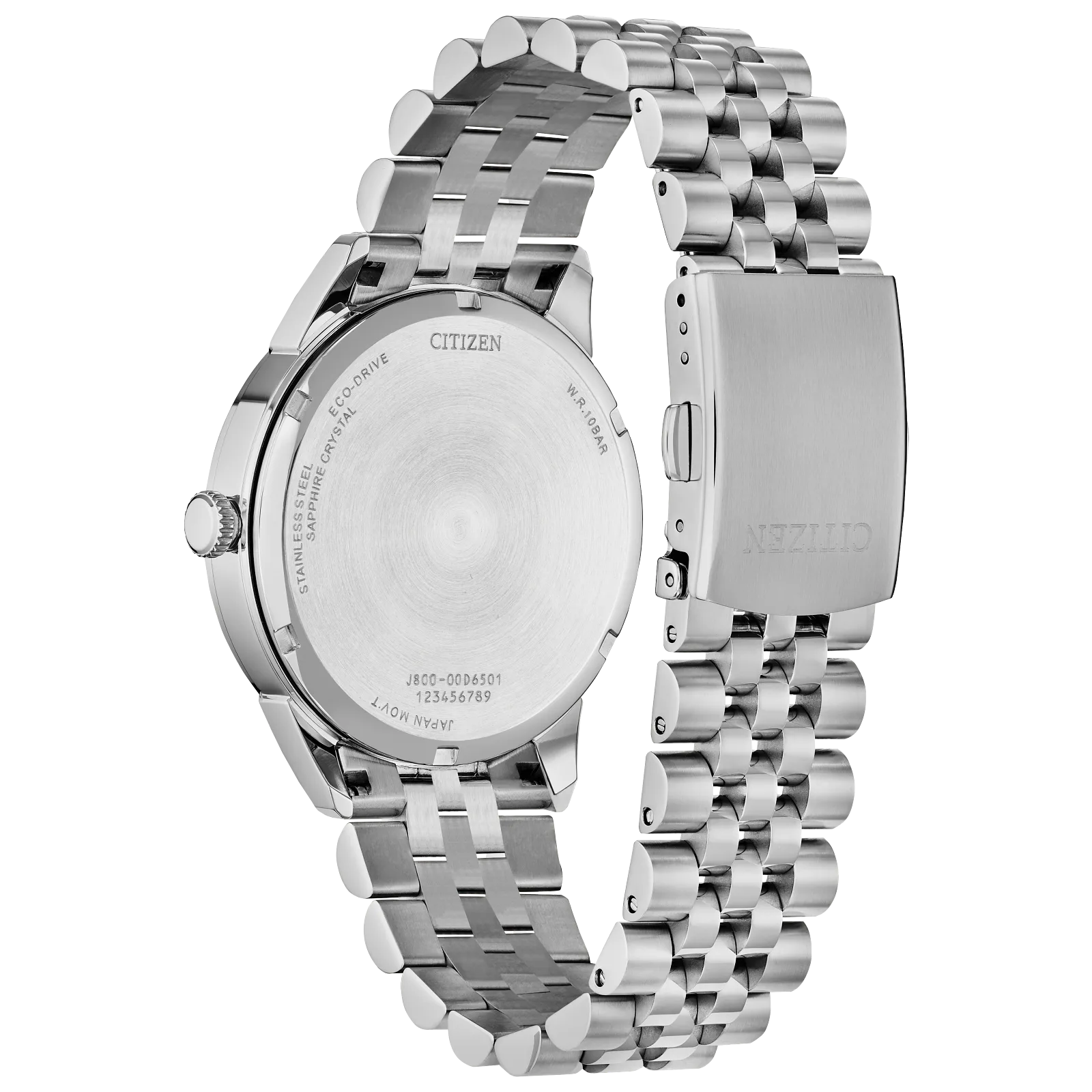 This vintage-inspired timepiece is a paragon of timeless elegance. With a 40.5mm, silver-tone stainless steel case and matching five-link bracelet, the new Rolan features a blue dial with a gradient effect. Applied silver-tone accents and Arabic numerals at the quarter hours add to its charm, while day and date indicators on opposite sides of the top and bottom of the dial place the watch firmly in the realm of retro-style. The watch features Citizen's Eco-Drive technology – sustainably powered by light, any light, and never needs a battery. Water resistant to 100 meters. Caliber J800.